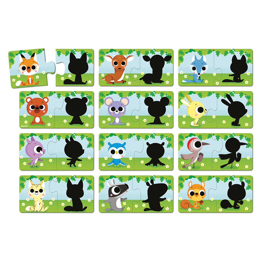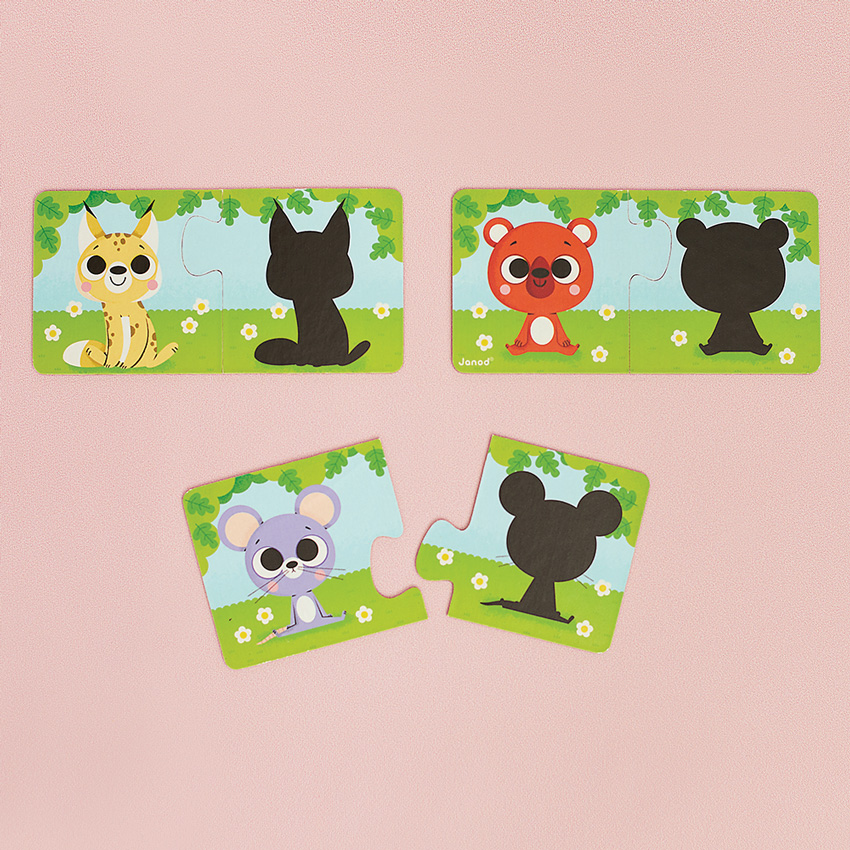 Who is hiding at the edge of the forest? Children aged 2 and up will love discovering woodland animals with this 12 puzzle pack. The aim of the game is to match each animal to its shadow by carefully studying the outlines of the animals to differentiate them and find the matching shadow pieces. Children can expand their vocabulary whilst promoting their thinking and problem solving skills. There are 12 puzzles in total each of having 2 pieces, so ideal for develping first puzzle skills. Made in France from study FSC certified cardboard pieces and decorated with vegetable-based inks.