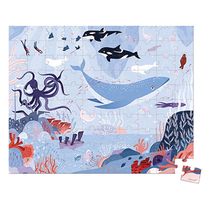 See how many sea creatures you can find in the Arctic Ocean Puzzle from Janod. Presented in the classic Janod suitcase with carry handle, this 100 piece jigsaw will fascinate once completed and is ideal for ages 6 and up. Made in France from FSC cardboard and plant based inks, the puzzle includes a poster to help the beginners, with the more experienced puzzlers able to complete the puzzle on their own. Explore the depths of the Arctic Ocean while developing your memory and dexterity!