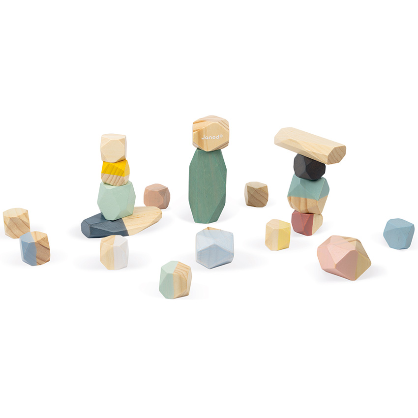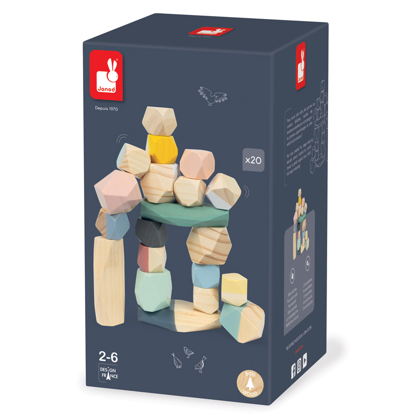 20 wooden blocks in a variety of shapes and sizes giving the appearance of faceted stones, encourage open ended play and fine motor skills. Learn the art of patience and balance by stacking the stones in whatever order you like, see how high or wide you can go or follow a colour pattern. Create a room display to decorate the playroom as the stones are water painted in muted contemporary colours. They are tactile and smooth with no sharp corners and are one of several items in the Janod Cocoon range.