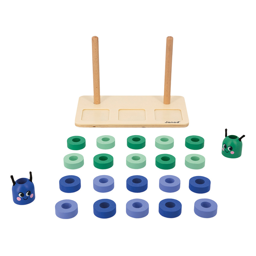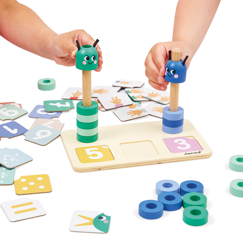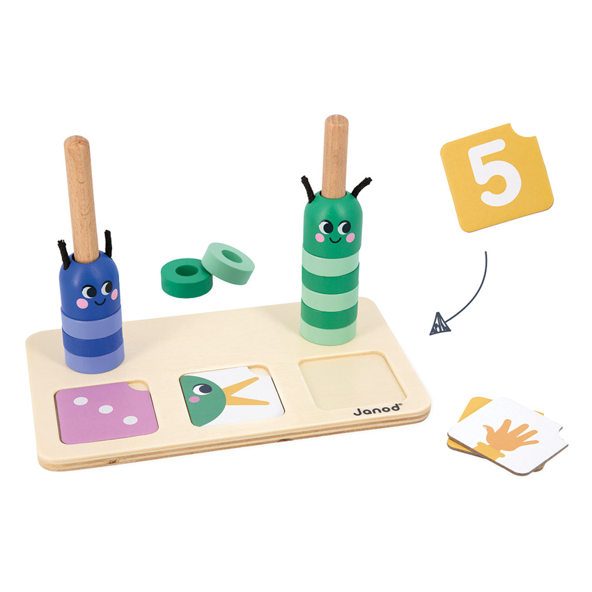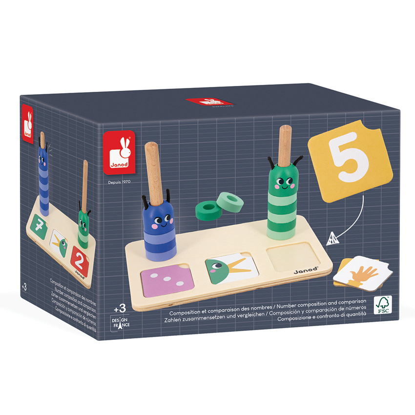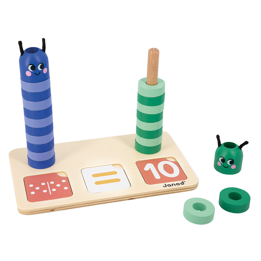 Learn how to make up and compare numbers with this Janod Counting Caterpillars game. This delightful wooden educational game is suitable for children aged 3 years and up - will make the number concept easier to grasp by physically displaying the numbers and manipulating them in terms of volume all by using the wooden base, 33 cards, 20 green and blue beads and 2 caterpillar heads. Children will use the coloured beads to form the body of the caterpillars, to reproduce the numbers indicated on the 33 game cards. The numbers may be shown as digits, fingers on a hand or polygonal dots (like on a dice). By stacking the beads onto the wooden stand, your child will understand how many beads to add or remove from the caterpillar's body to obtain a given quantity. Once this first step has been mastered, it will be time to touch upon the notion of comparison, e.g. ?greater than? and ?less than?, with the help of the special cards. The instruction leaflet will help you make the most of this game intended for little ones. This game is part of an educational range developed in collaboration with a school teacher, in order to best replicate the learning process and ensure progress is made at each level. Made from FSC wood and cardboard.