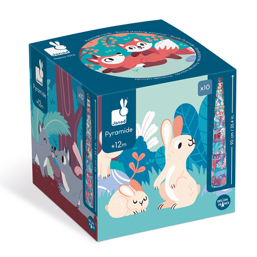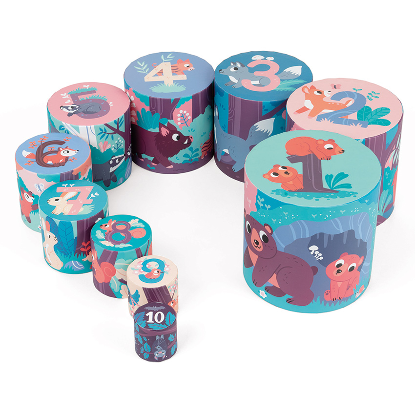 A stacking tower with an unexpected twist. This cylindrical shaped stacker has whimsical animal designs and comes with 10 different sized stacking pieces which store inside each other all numbered one through ten for simple beginners math. Once the pieces are matched together an enchanting vertical play scene is created. Made from heavy duty card, it is presented in a delightful gift box, great for gift giving.