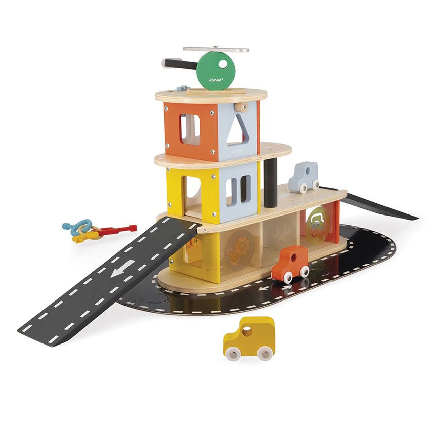 Perfect for developing fine motor skills and role play imagination your child will spend hours inventing great stories and manoeuvring all kinds of vehicles around this amazing garage which is part of the Janod Bolid vehicle range. Designed for the over 2's, the 4 level Garage is created from FSC certified wood and high-quality materials including water-based paint to ensure they are robust, safe and eco-friendly! The outside circuit is made from FSC cardboard. Simply lock the pieces together like a jigsaw around the base and place the wooden ramps at either end to inspire your own driving adventures! With 4 floors of amazing fun and educational STEM concepts, start at the bottom floor which has a garage for each of the 3 included cars. To open the garage doors and store the cars, you first have to choose the right geometric shaped key which are also colour coded to match the vehicle you are storing, perfect for beginners. Once you have chosen the correct key to unlock your parking spot, drive your vehicle up the ramp to the second level car wash for a good clean. Then turn the cog wheel to lift your car to the third level parking bay and watch the helicopter come in to land on the 4th floor helipad bringing it's VIP guests or emergencies. Co-developed with a pre-school specialist to introduce educational concepts in a simple and fun way, the garage has several purposes for learning making it a great resource not only at home, but for schools, kindergartens and child care centres as well.