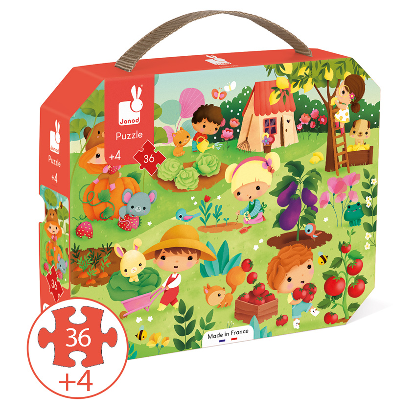 It's harvest time in the garden! Put the 36 piece jigsaw together to see everyone picking lemons and tomatoes, cabbages and pumpkins. The Garden Puzzle from Janod is presented in their classic suitcase with carry handle, perfect for taking on your travels and easy pack up in the playroom. Printed in vegetable based inks with a poster to help beginners, the Garden Puzzle is made in France from FSC certified cardboard and one of many in the Janod puzzle range.
