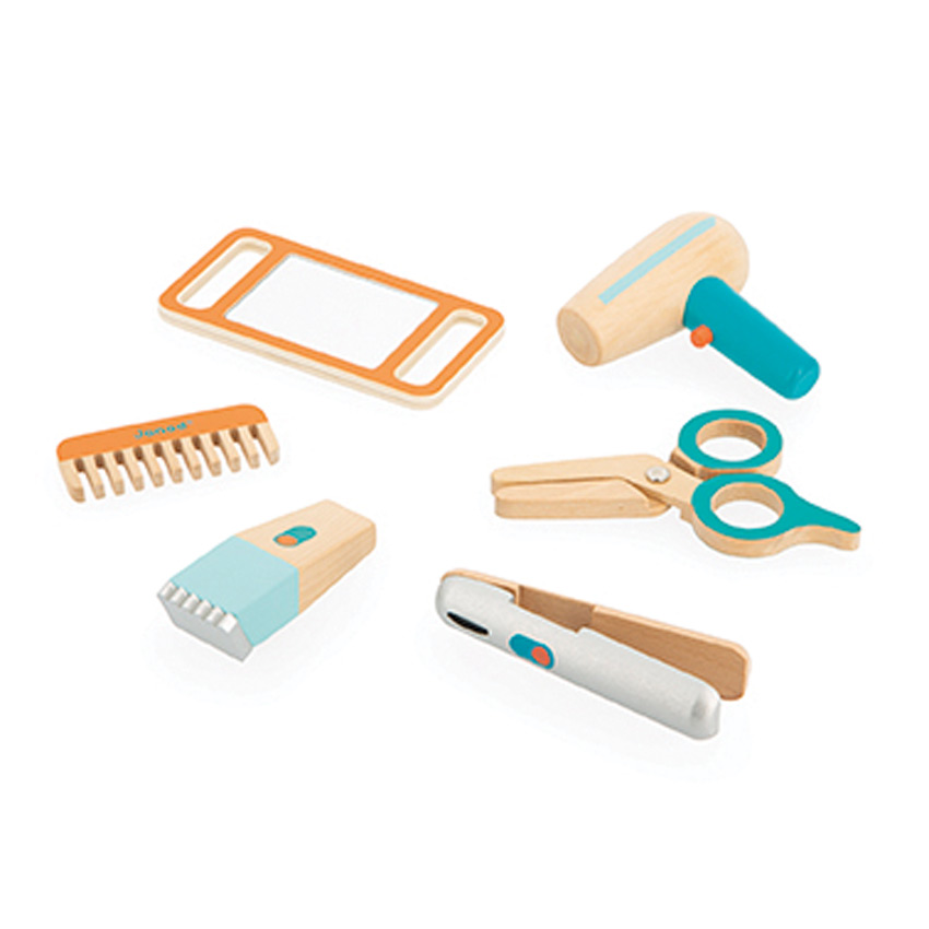 Time for a trim... or perhaps a complete makeover? Role play is essential for healthy development, not to mention it's a load of fun! This cute Hairdresser Set from Janod includes a straightener, comb, pair of scissors, a mirror, hairdryer and a set of clippers - everything you need to emulate a glamorous career as a hair stylist! Practice on dolly to 'brush' up your skills and once you're finished playing, all six accessories fit neatly in the fabric carry case with handle. Perfect for encouraging your child's imagination, the accessories are water painted and made from FSC wood.