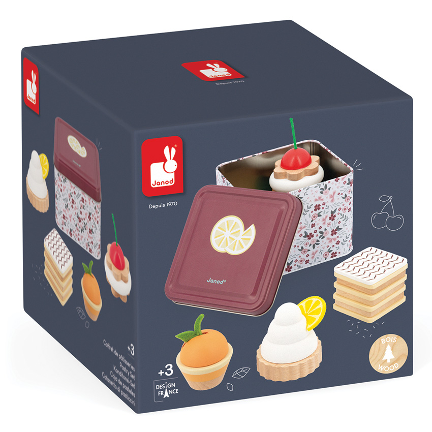 The Janod Pastry set is an ideal addition to any kitchen or role play set. 4 very realistic cakes are presented in an attractive metal tin that perfectly complements other food play items in the Janod range. Perfect for developing imagination, interactivity with others and encouraging creativity. Suitable for children aged 3 years and up.