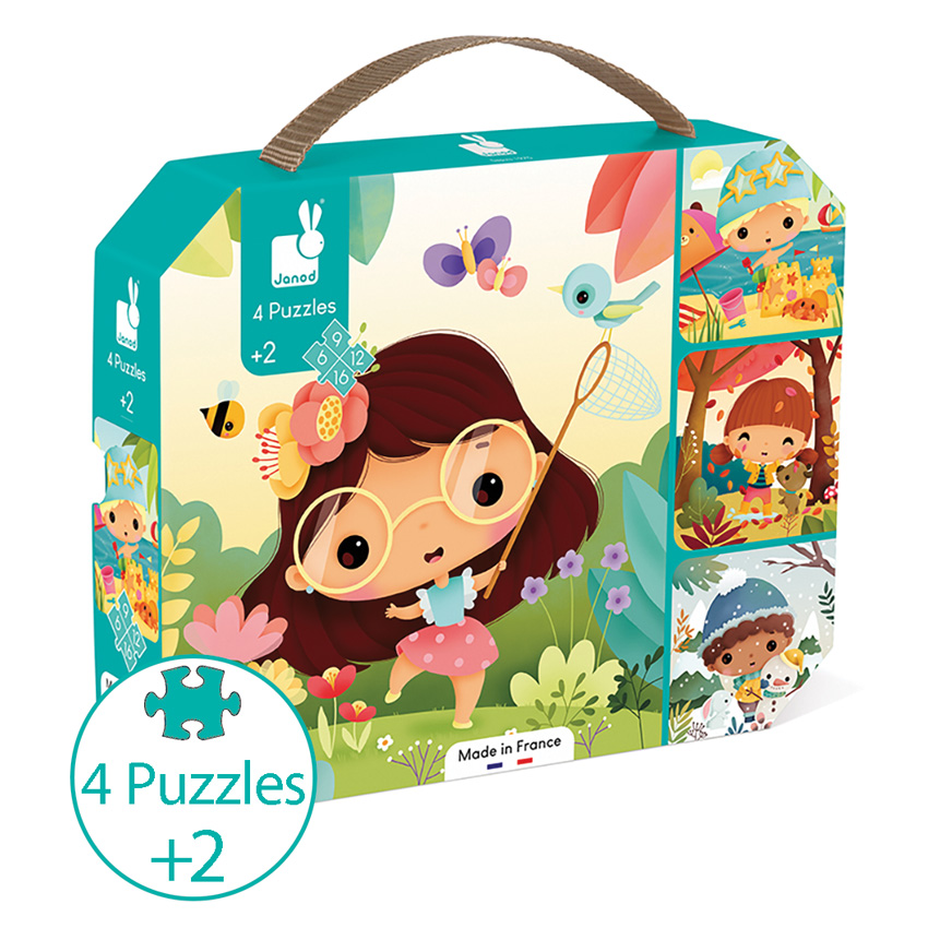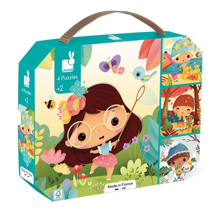 Discover what makes each season unique with the 4 Seasons progressive puzzles. With these 4 evolving puzzles, children aged 2 years and over can explore when and how nature changes throughout the year. Each puzzle ? composed of 6, 9, 12 and 16 pieces respectively, will help children progress whilst stimulating their fine motor skills and concentration. Each puzzle getting a little more detailed and pieces reducing in size scale as you move from season to season. A unique colour on the back of each puzzle will make it easier for your child to find the correct pieces to work with. Ideal for developing patience and fine motor skills. Packed in a stylish suitcase-shaped box with carry handle, 4 Seasons can easily be taken on holiday or when visiting friends or relatives. Made in France from sturdy FSC cardboard and decorated with vegetable inks.