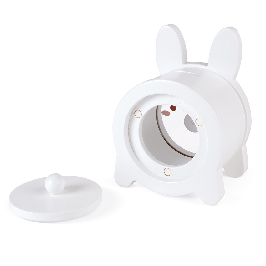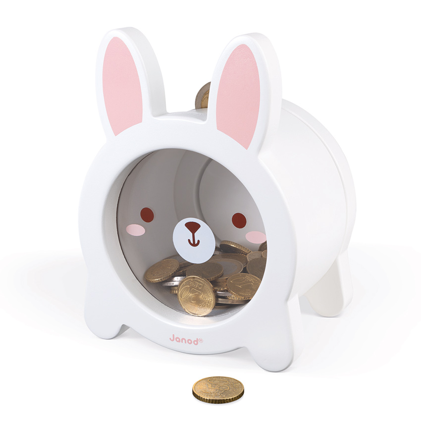 The Janod Rabbit Money Box has a perspex front so you can see your savings adding up and a magnetic back so that you can withdraw your savings when you think you have enough for your chosen reward. When you have counted out what you need, simply pop the backing plate back on and place it onto the bookshelf to continue saving. Made from wood this adorable bunny is larger than it looks and is solidly robust to hold the weight of coins when it is full.