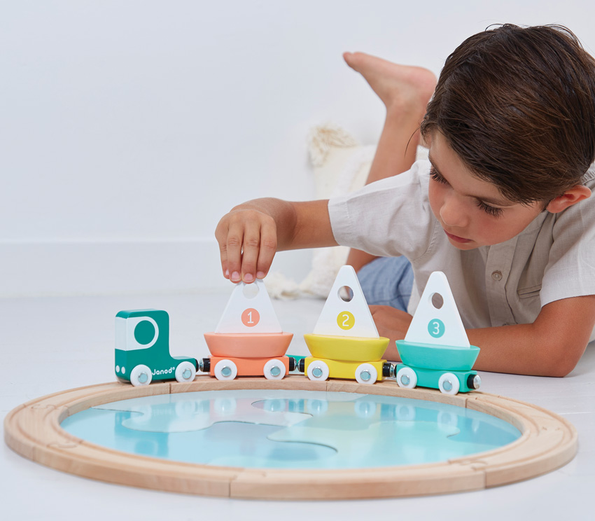The Janod Sailing Boat Circuit is an ultra-complete early-learning game that is ideal for children aged 2 years and up who like to have fun with a whole host of different means of transport! The idea is simple: To start the adventure, create the water by assembling the 4 large blue jigsaw pieces, ready to place the 3 wooden sailing boats on to. Next create the track - which composes of 8 wooden pieces and surround the body of water. The wooden lorry and its 3 magnetic wagons create the road train and with its crane comes a fishing rod your child will be able to load up the boats onto or off the water, developing their Imaginations and motor skills as they play! The crane come fishing rod is stored at the back of the road train cabin when not in use. This beautiful early-learning toy from the Bolid range is made from FSC certified wood and cardboard. The tracks and road train are compatible with other wooden train sets. How clever of you Janod!