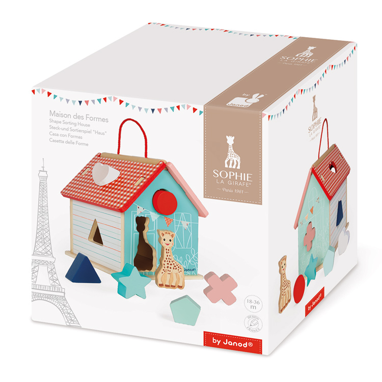 The Sophie La Giraffe Shape Sorting House is ideal for learning colours and shapes, and for playing with Sophie La Giraffe in her lovely house! The 7 blocks will fit into the house in their correct slot and the roof is detachable to easily remove the blocks when complete. The carry handle allows you to take this wooden sorter anywhere and will help toddlers develop their dexterity while having fun.