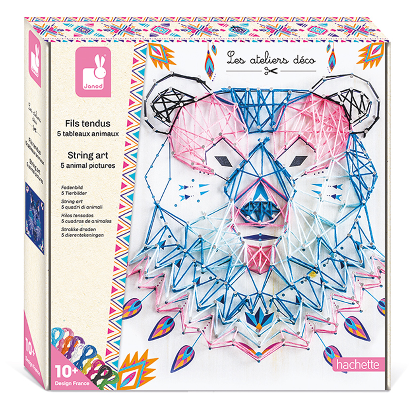 This creative kit allows you to make 5 amazing string art portraits of animals (1 large and 4 small) by following the step-by-step instruction booklet. The set contains 5 foam boards in 2 different sizes, 800 tacks, 10 skeins of brightly coloured thread, 1 threading tool and an instruction booklet. Simply place your tacks in position on the board and run your string around them to form the pictures. Aimed at the pre-teen age range, they are an ideal gift to let them create their room decor in their own sense of style! One of many items in the Janod craft range, the String Art Animal Pictures will encourage creativity and pride when the art is completed.