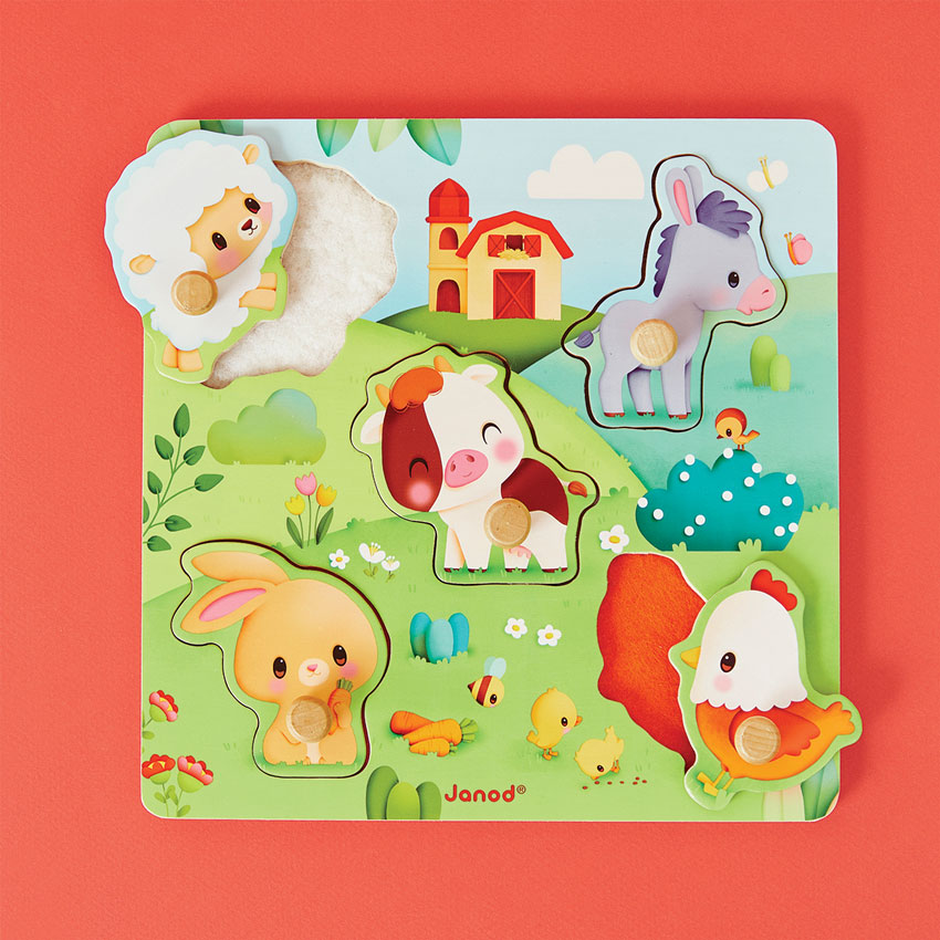 Introduce your toddler to farm animals with this delightful tactile wooden puzzle. Featuring five animal pieces with easy-to-grip pegs, it encourages exploration and sensory play. Each piece reveals a textured surprise beneath, mimicking the animal?s coat to develop your child's sense of touch, dexterity, and problem-solving skills.