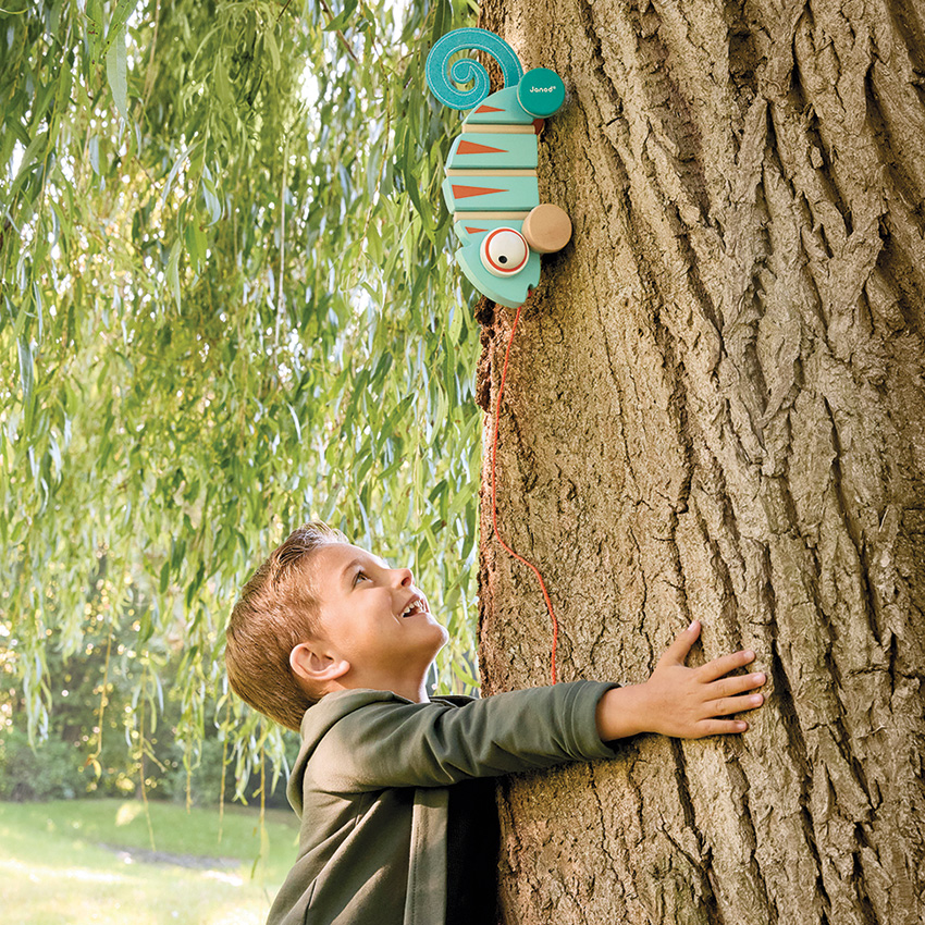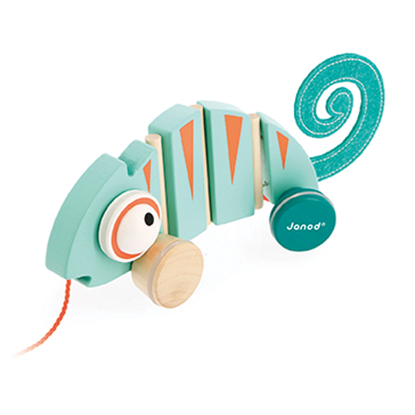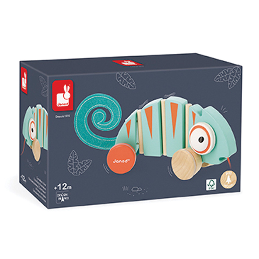 Chameleons eyes are independently mobile and the Tropik Pull Along Chameleon is exactly the same! Made from FSC certified wood and coloured using water-based paints, this delightful chameleon rolls his eyes as you pull him along. His articulated elastic body and soft felt tail, together with those googly eyes, give this loopy lizard a funny and yet endearingly entertaining gait! Perfect for encouraging your child to walk and helping them develop their overall motor skills, the chameleon is a great pull-along toy for children aged 12 months and up. The Janod Tropik range brings together cheerful animals in vibrant colours from the rainforest to delight and entertain while having a load of learning fun! Who is ready for a stroll with an eye roll?