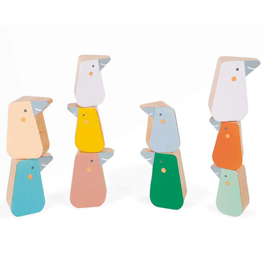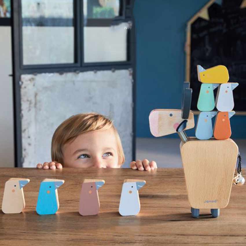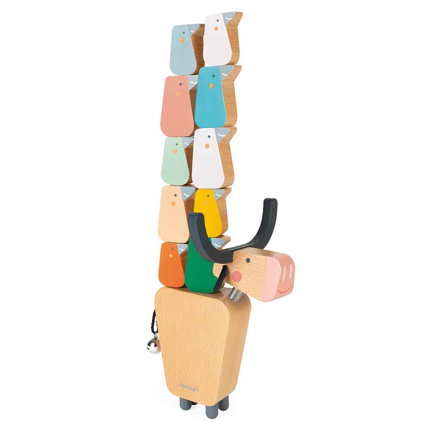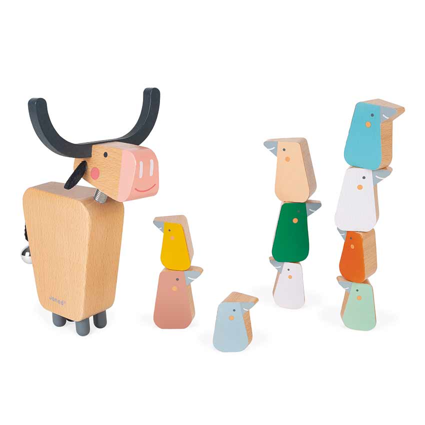 The buffalo will do his best to retain his stoic calm as players take turns to cover his back with more and more little birds. Be careful! It's really easy to unbalance the buffalo, causing all the birds to fall to the ground! The player who puts on one bird too many is the loser! Made from FSC wood, the Water Buffalo Balancing Game is a game of skill, perfect for developing patience and dexterity and fine motor skills. The game includes a buffalo with a bell on his tail and a spring in is neck that bounces around delighting the players and adding a challenge to avoid. His ears are made of soft felt adding a tactile element and he has 10 bird companions in contemporary colours varying in size increasing your skill level. You can also use the birds separately as a stacking game, counting as you go! Suitable for children over the age of 3, this game has many elements to love and when you're finished playing, pop him on the shelf for some great room decor!